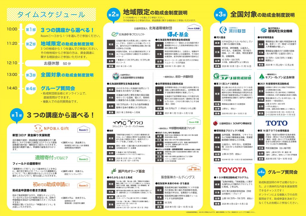 | スケジュール | ■ 9:30~ 開場(zoom入室可能時間) ■10:00~ 第1部 3つの講座から選べる! ※3つの講座から、聞きたい講座を1つ選んでご参加ください。 ■11:20~ 第2部 地域限定の助成金制度説明 ※3つの地域から、聞きたい地域を1つ選んで、ご参加ください。 その他地域からご参加の方は、資金調達に関する相談会にご参加いただけます。 ■12:10~ お昼休憩 ■13:00~ 第3部 全国対象の助成金制度説明 ■14:40~ 第4部 グループ質問会 |