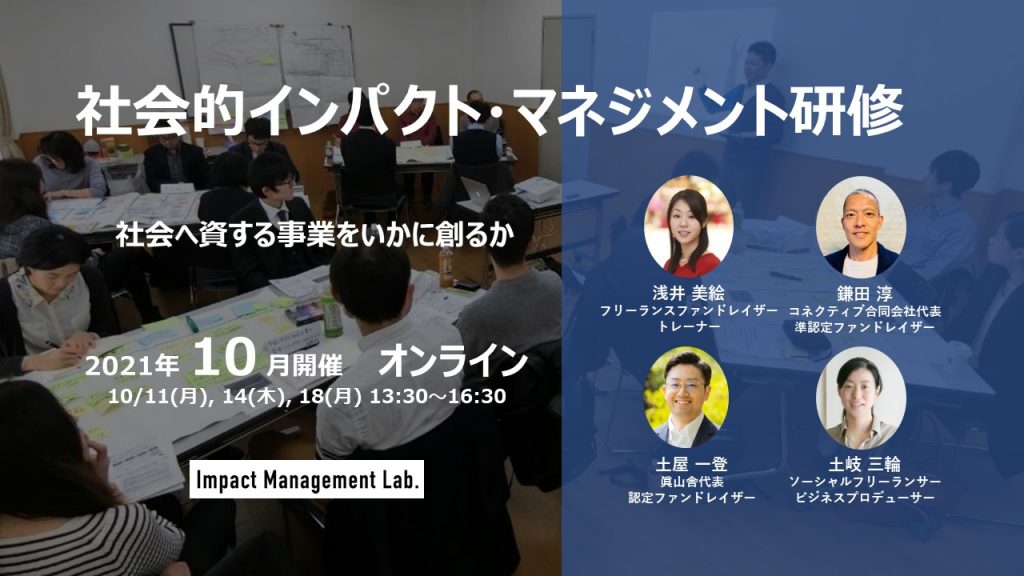 | 講師・登壇者 | ●鎌田 淳 コネクティブ合同会社・代表 事業デザイナー/准認定ファンドレイザー ●浅井 美絵 フリーランスファンドレイザー/トレーナー ●土屋 一登 眞山舎代表 / 認定ファンドレイザー ●土岐 三輪 一般社団法人インパクト・マネジメント・ラボ アソシエイト・共同代表 |