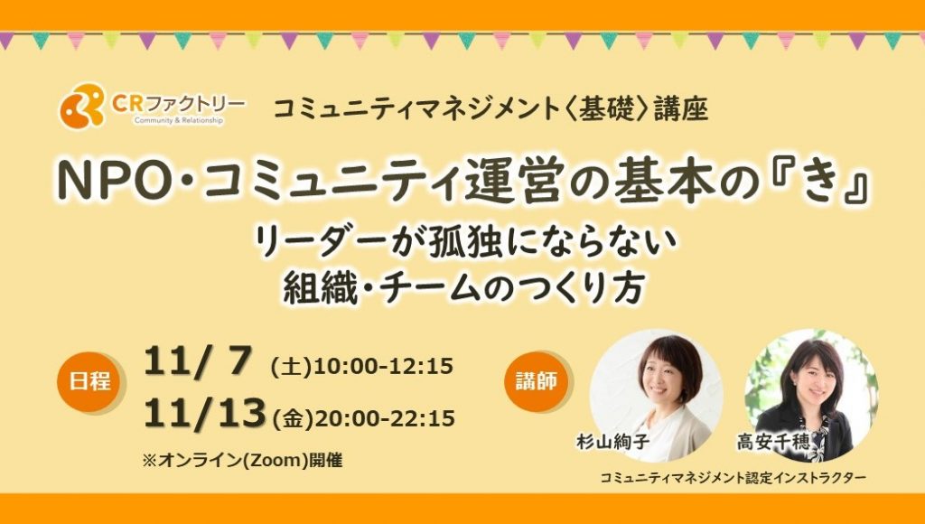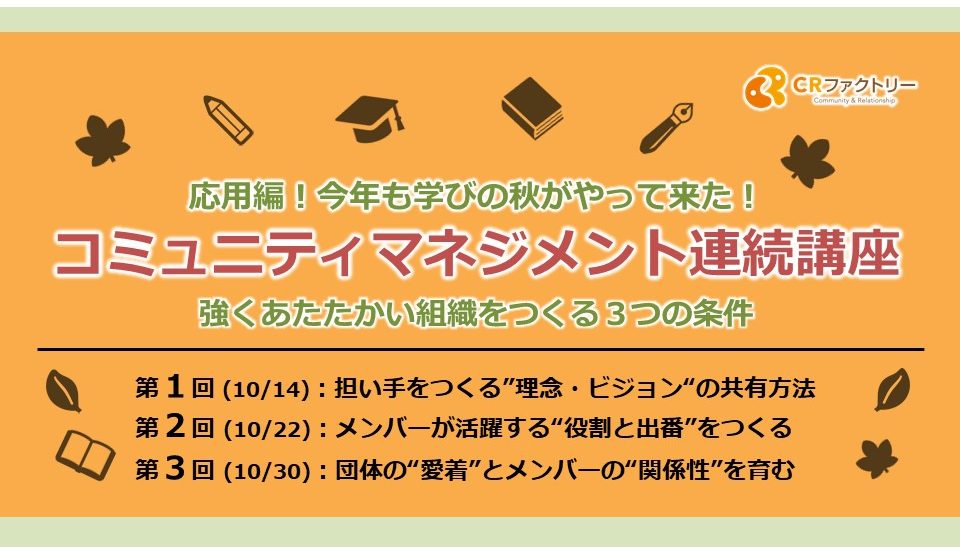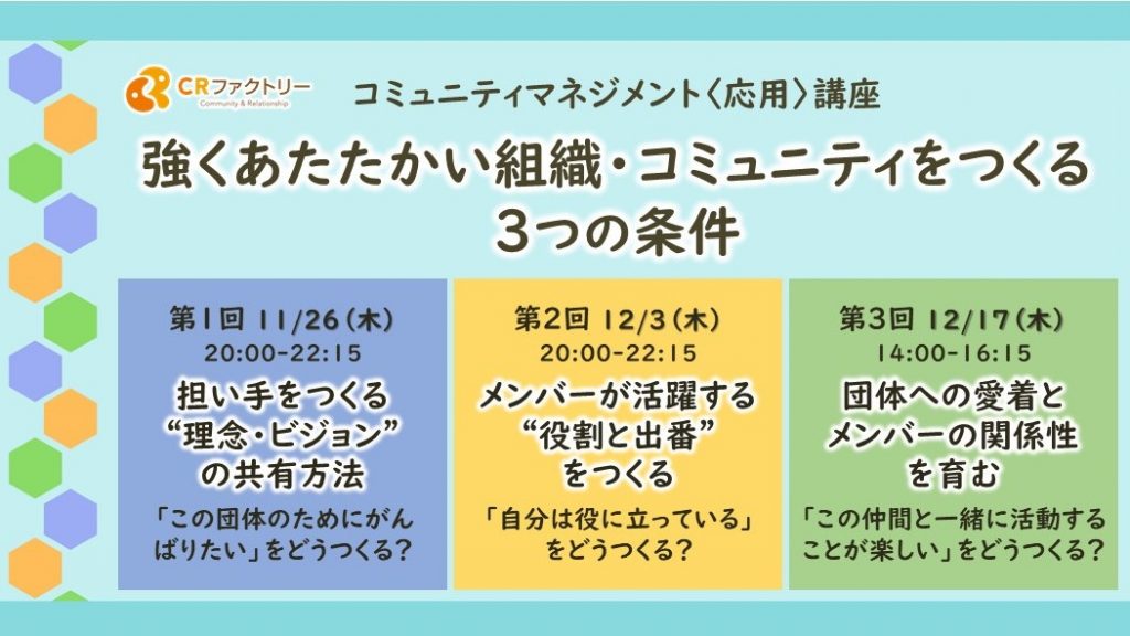 【オンライン開催《全3回:11/26,12/3,12/17》】コミュニティマネジメント応用講座〜強くあたたかい組織をつくる3つの条件〜